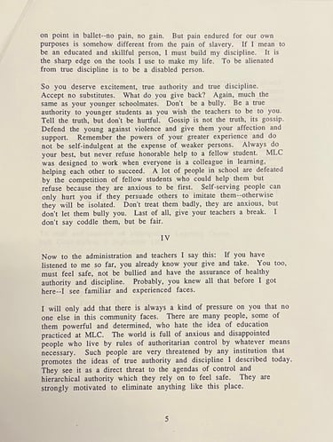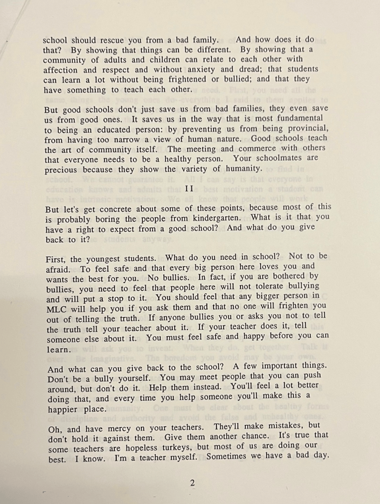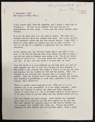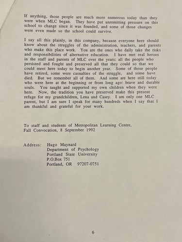 The text of MLC parent, grandparent, and PSU psychology professor Hugo Maynard's 1992 talk at that Fall's MLC convocation, welcoming students (and parents). The original document was preserved by Betty Mayther.
