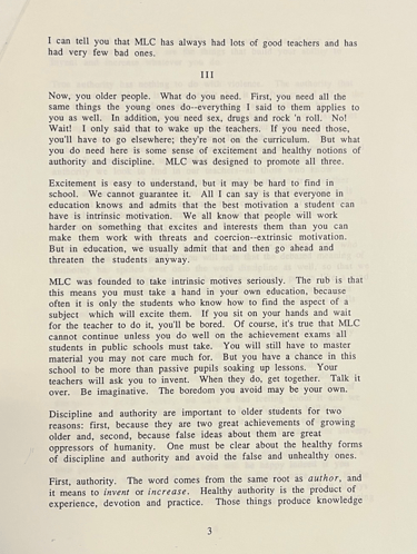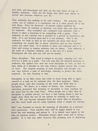 "What you do need here," Maynard wrote, and said, "is some sense of excitement and healthy notions of authority and discipline." Goodness! "MLC was designed to promote all three," Maynard asserted.