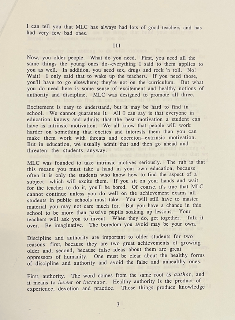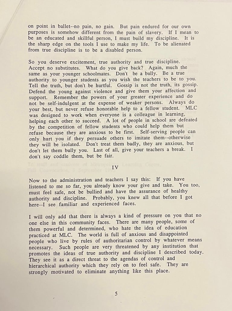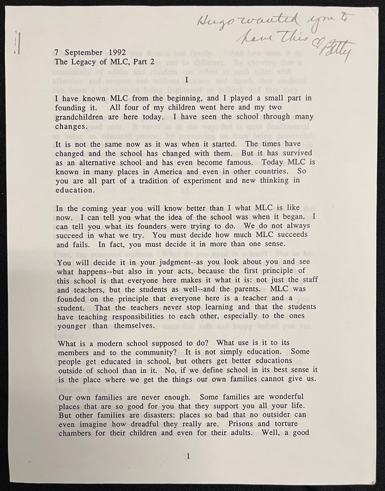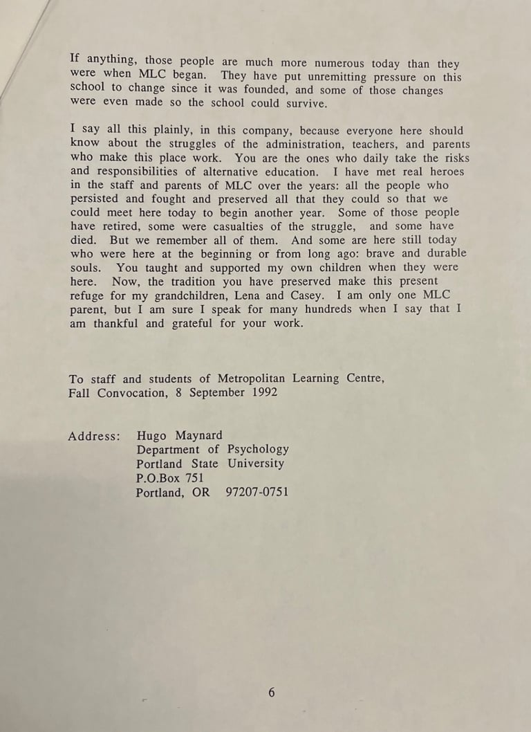 MLC IS NOT KNOWN for its formality, but in Fall 1992, MLC had a Convocation, and—perhaps due to the influence of founding teacher Betty Mayther, beginning her final year before retirement, or of principal Pat Burk, starting his second year (he was tapped for higher position after his third)—it was Hugo Maynard who delivered the convocational talk, the lecture or keynote address.