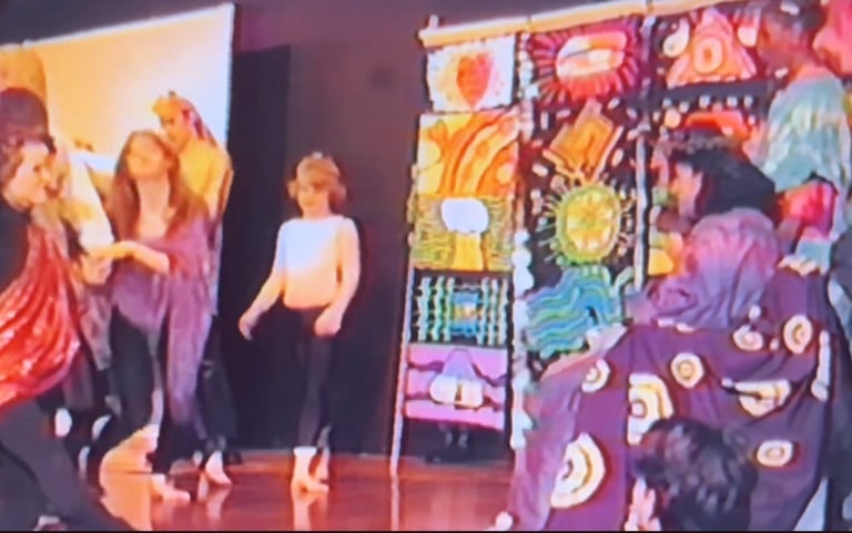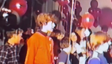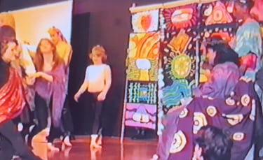 Mannie and others responding on Facebook identified teachers and students in the video: Brice Pace, Judith Kleinstein, Patte Sullivan, Leah Darr, Gail Brooks, Craig Holt, Barbara Stross, and Ruth Frankel; Betty, Chris, and Bill Mayther; Kojo (as Goblin King) and Shelley; Jeffrey Reynolds on violin, Will Wigmore on guitar; Ralph Lorance, Martha Vail, Antoinette Edwards, Claire Cofsky, Jan Moore, and Gayle Springmeier; Roby Roberts; Alder, Leah Graham, Zoe, and Marisa O’Bar.